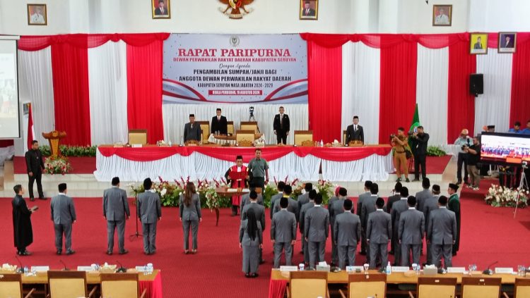 Sinarkalteng.com, KUALA PEMBUANG – Sebanyak 25 anggota DPRD Kabupaten Seruya terpilih untuk masa keanggotaan 2024-2029 hasil Pemilu Legislatif (Pileg) 2024 resmi dilantik, di Aula Paripurna DPRD Seruyan, Senin (19/8/2024).