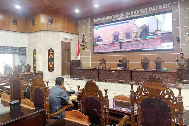 KUALA KAPUAS – DPRD Kabupaten Kapuas menggelar rapat paripurna dalam rangka penyampaian pemerintah daerah terhadap tiga buah Raperda. Rapat paripurna dipimpin oleh Wakil Ketua I DPRD Kabupaten Kapuas, Yohanes dan dihadiri Pj Bupati Kapuas Erlin Hardi, Sekda Septedy, para kepala perangkat daerah dan perwakilan unsur Forkopimda Kabupaten Kapuas.
