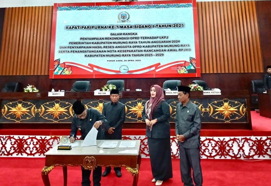 Sinarkalteng.com, PURUK CAHU  – DPRD Kabupaten Murung Raya, Kalimantan Tengah melaksanakan paripurna masa sidang I dengan agenda penyampaian rekomendasi terhadap Laporan Keterangan Pertanggungjawaban (LKPJ) Bupati tahun anggaran 2024, penyampaian hasil reses, dan penandatanganan nota kesepakatan rancangan awal Rencana Pembangunan Jangka Menengah Daerah (RPJMD) 2025-2029.