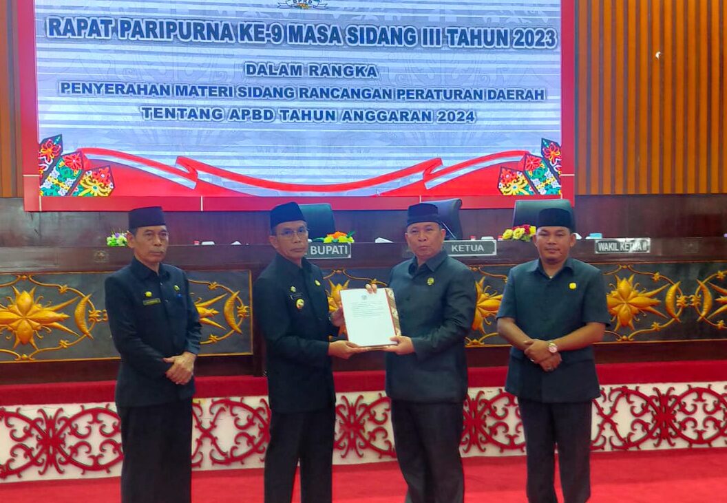 PURUK CAHU – Materi sidang Rancangan Peraturan Daerah (Raperda) tentang Anggaran Pendapatan dan Belanja Daerah (APBD) tahun anggaran 2024 diterima oleh DPRD Kabupaten Murung Raya pada rapat paripurna ke 9 masa sidang III tahun 2023. Penyerahan Materi sidang tersebut oleh Pj Bupati Mura, Hermon kepada Ketua DPRD Murung Raya, Doni, didampingi Wakil Ketua II DPRD Murung Raya, Rahmanto Muhidin, Kamis (23/11/2023).
