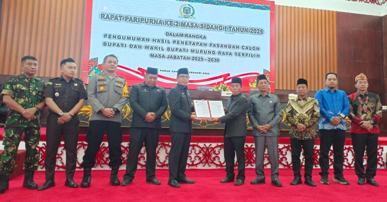 Sinarkalteng.com, PURUK CAHU – Dewan Perwakilan Rakyat Daerah (DPRD) Kabupaten Murung Raya menggelar rapat paripurna ke -2 masa sidang tahun 2025 dalam rangka pengumuman hasil penetapan pasangan calon Bupati dan Wakil Buapti Murung Raya terpilih masa jabatan 2025 – 2030, Sabtu (8/02/2025).