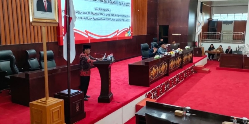 PURUK CAHU – DPRD Kabupaten Murung Raya (Mura) menggelar Rapat Paripurna dalam rangka penyampaian pemandangan umum fraksi-fraksi DPRD Mura terhadap dua buah rancangan peraturan daerah di gedung DPRD Murung Raya, Selasa (7/11/2023).