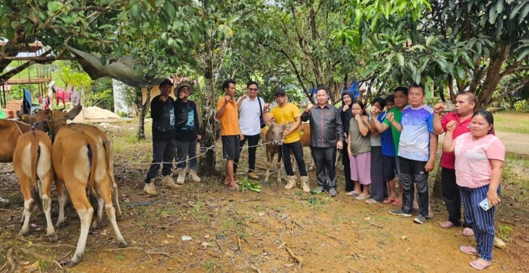 PURUK CAHU – Ketua DPRD Murung Raya (Mura), Dr. Doni, SP, M.Si menyerahkan bantuan sapi kepada dua kelompok tani yakni Poktan Nyarung Pio Desa Batu Mirau, Kecamatan Sungai Babura sebanyak 12 ekor dan Poktan Tumenggung Jadam Kelurahan Tumbang Lahung, Kecamatan Permata Intan sebanyak 9 ekor sapi.
