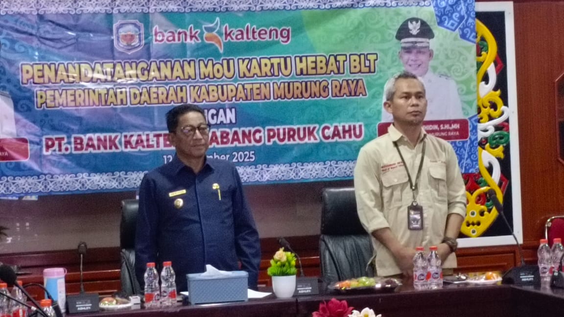 SinarKalteng.com, PURUK CAHU – Pemerintah Kabupaten Murung Raya (Mura) menandatangani MoU dengan PT Bank Kalteng Cabang Puruk Cahu untuk mempercepat realisasi penyaluran program Kartu HEBAT Bantuan Langsung Tunai (BLT). Program ini menyasar 1.100 penerima manfaat di seluruh wilayah Murung Raya.