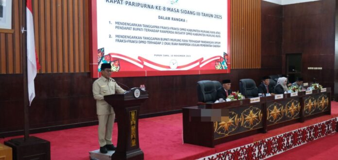 Bupati Murung Raya, Heriyus, menyampaikan jawaban dan tanggapan atas Pemandangan Umum Fraksi-Fraksi DPRD terkait dua Raperda ini dalam Rapat Paripurna ke-8 Masa Sidang III, Senin (10/11/2025).