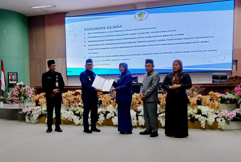 SinarKalteng.com, MUARA TEWEH – Pemerintah Kabupaten Barito Utara melalui Penjabat (Pj) Bupati Indra Gunawan menerima pandangan umum fraksi-fraksi DPRD Kabupaten Barito Utara terhadap Laporan Pertanggungjawaban Pelaksanaan Anggaran Pendapatan dan Belanja Daerah (APBD) Tahun Anggaran 2024.