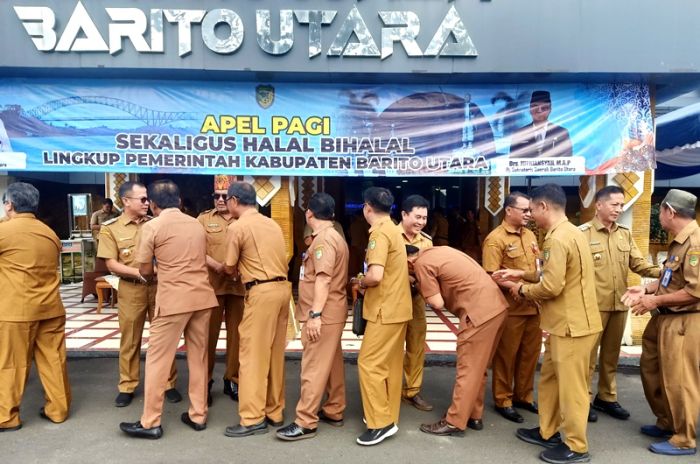 Sinarkalteng.com, MUARA TEWEH – Pemerintah Kabupaten Barito Utara menggelar apel gabungan sekaligus halal bihalal di halaman Kantor Bupati setempat, Selasa (8/4/2025). Susana penuh kehangatan dan kebersamaan yang mewarnai apel paca libur lebaran Idul Fitri 1446 H.