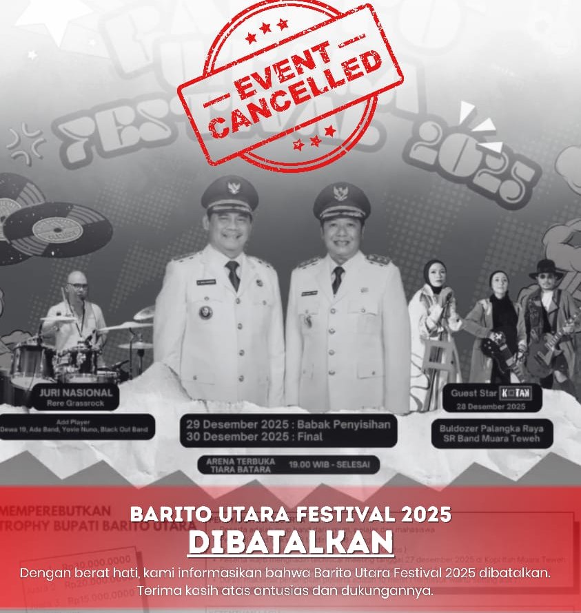 Sinarkalteng.com, MUARA TEWEH – Pemkab Barito Utara (Barut) memutuskan untuk meniadakan seluruh kegiatan hiburan, seni, dan musik dalam rangka Festival Barito Utara Tahun 2025.