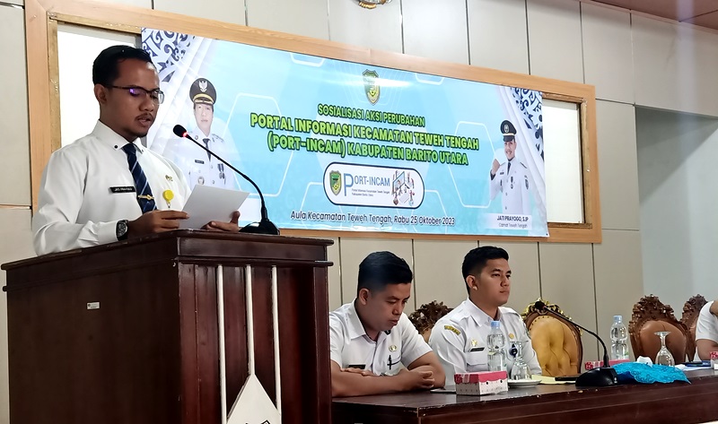 MUARA TEWEH – Kantor Kecamatan Teweh Tengah, Kabupaten Barito Utara melaksanakan sosialisasi terkait aksi perubahan “Portal Informasi Kecamatan (Port-Incam) Teweh Tengah, di aula Kecamatan setempat, Rabu (25/10/2023).