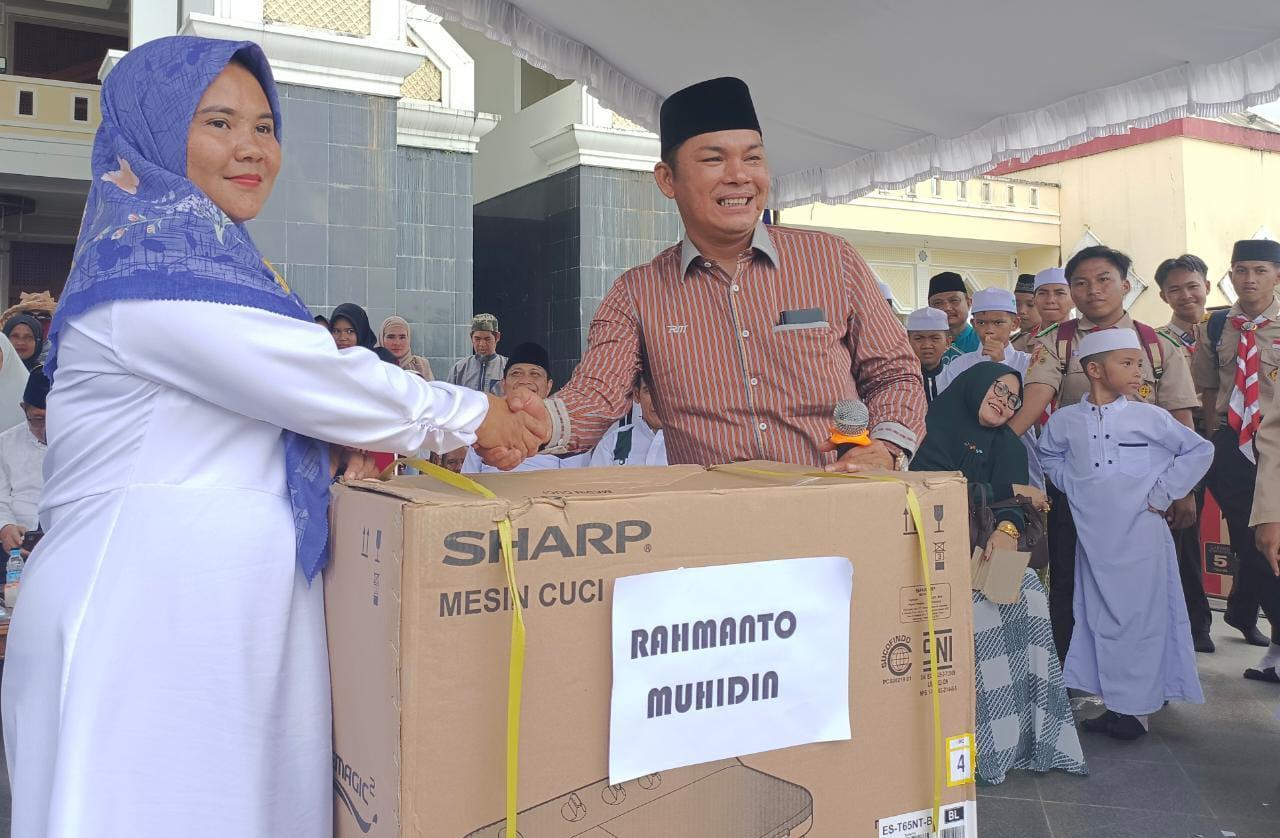 PURUK CAHU – Wakil Ketua II DPRD Murung Raya (Mura), Rahmanto Muhidin menyumbangkan sebuah mesin cuci untuk hadiah doorprize pada pawai akbar tahun baru islam I Muharram 1445 H/2023 M.