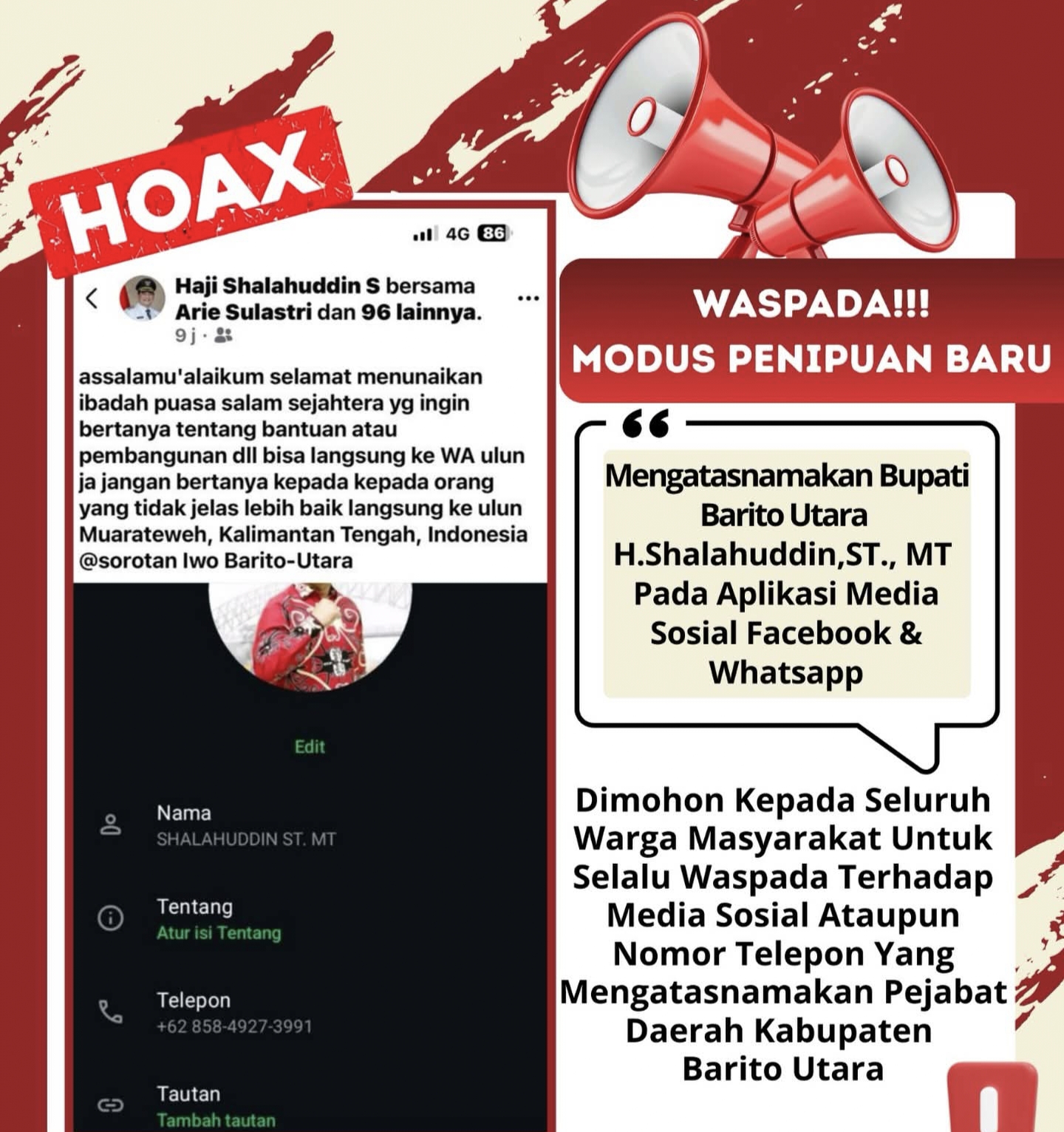 Sinarkalteng.com, MUARA TEWEH – Maraknya modus penipuan yang mengatasnamakan Bupati Barito Utara, H. Shalahuddin, melalui media sosial dan pesan singkat mendapat perhatian serius dari DPRD Kabupaten Barito Utara. Anggota legislatif langsung mengimbau masyarakat agar meningkatkan kewaspadaan.
